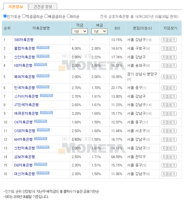 재테크포털 사이트인 모네타에서는 전국 상호저축은행의 금리를 비교해서 순위를 알려줍니다. 저축 은행의 인기도순, 금리순, 예금 금리순 등을 선택하면 선택한 항목에 따라 저축은행의 순위를 보여주기 때문에 저축은행 간 금리 비교하기가 쉽습니다.