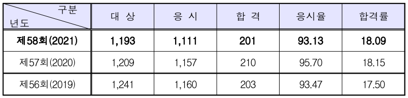 | 제58회(2021) | 1,193 | 1,111 | 201 | 18.09 |