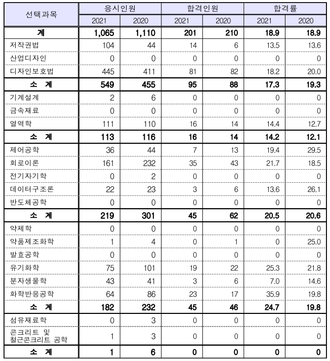 선택과목 별 응시 인원과 합격인원 및 합격률은 아래 표와 같습니다.