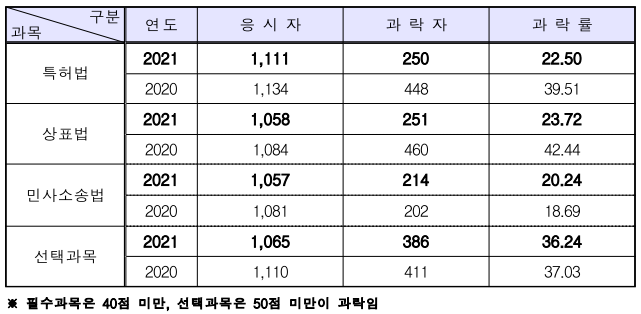 특허법이 22.5%, 상표법이 23.72%의 과락률을 기록하며 지난해보다 과락률이 크게 하락해 시험이 쉽게 출제되었음을 알 수 있습니다.