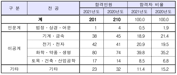 2021년 변리사 2차 시헙 합격자의 전공을 살펴보면 화학·약품·생명 전공이 전체 합격자의 39.8%인 80명으로 가장 많았고, 전기·전자 전공이 42명, 기계·금속 전공이 38명이었으며, 인문계열을 전공한 합격자는 1명이었습니다.