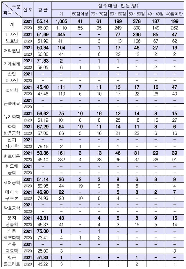2021년 변리사 2차 시험은 60점 대 합격자가 11명이며 50점 대 인원도 532명이나 돼 지난해보다 시험이 쉬웠음을 알 수 있습니다.