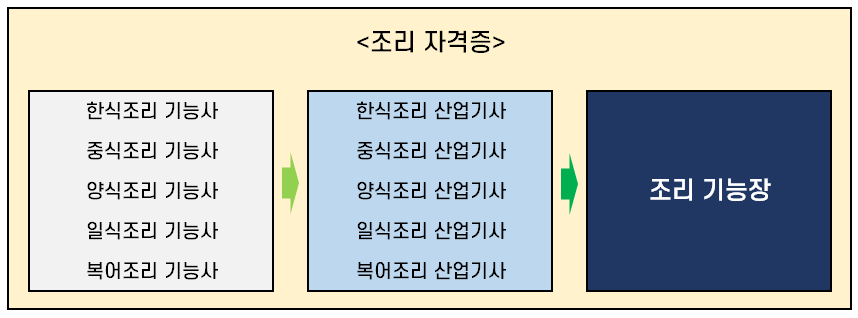 조리 자격증은 기능사, 산업기사, 기능장의 3가지 등급 자격증만 존재하는데요.