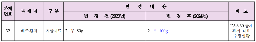 33가지 메뉴 중 배추김치, 오이소박이 2개과제는 2024년에 새롭게 추가된 과제이며, 2023년 6월 30일에 공개된 과제에서 아래 표와 같이 배추김치의 지급재료가 변경되어 2024년부터 출제되니 착오없이 준비하시기 바랍니다.
