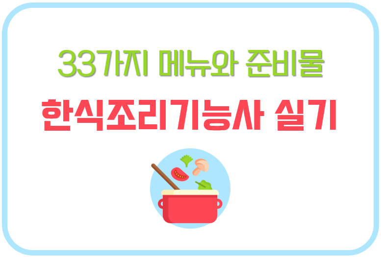 한식조리기능사 메뉴 33가지에 대해 현장에서 지급되는 재료의 목록과 수량, 레시피 및 조리과정상 주의사항은 파일로 첨부하니 꼭 읽어본 후 연습하시기 바랍니다.