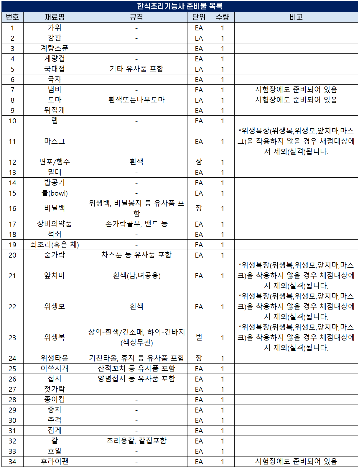 | 22 | 위생모 | 흰색 | *위생복장(위생복,위생모,앞치마,마스크)을 착용하지 않을 경우 채점대상에서 제외(실격)됩니다. |