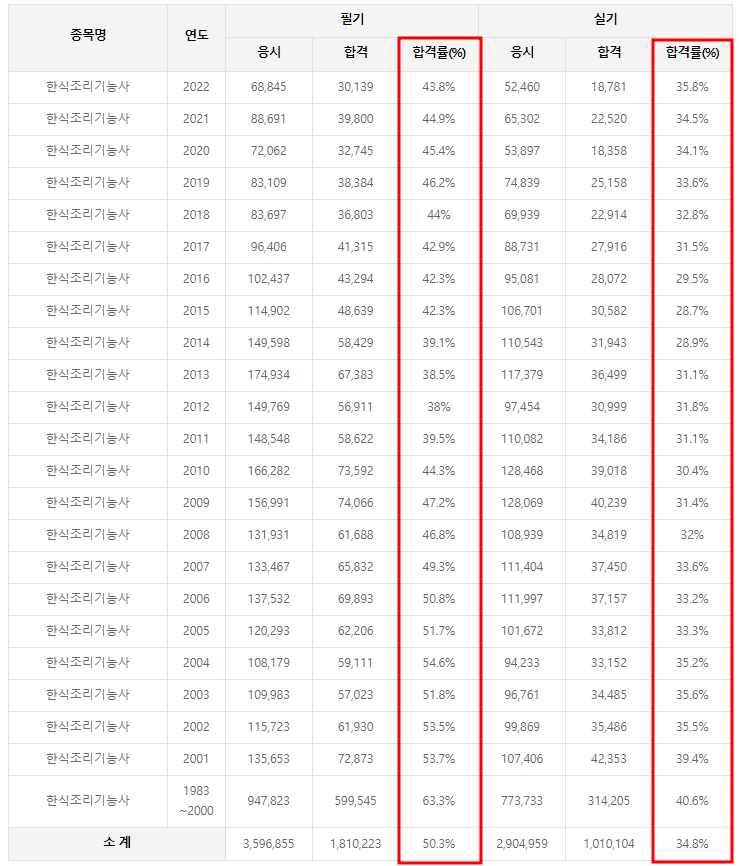 한식조리기능사 필기시험은 합격률이 50% 정도로 높은 편이라 그리 어렵지 않게 합격할 수 있는 수준인데요. 보통 1~2주 공부하면 충분히 합격합니다.
