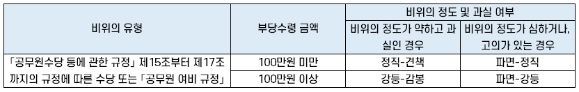 | 비위의 정도가 심하고 고의가 있는 경우 | 비위의 정도가 심하고 중과실이거나, 비위의정도가약하고고의가있는경우 |
