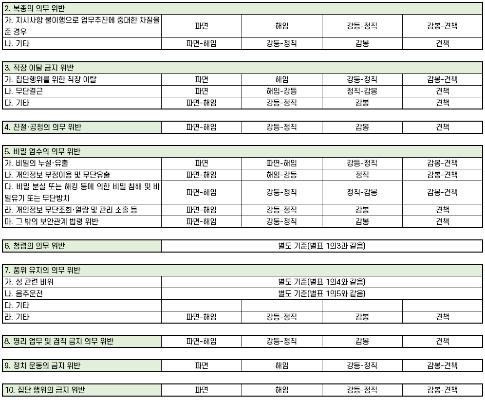 | 가. 집단행위를 위한 직장 이탈 | 파면 | 해임 | 강등-정직 | 감봉-견책 |