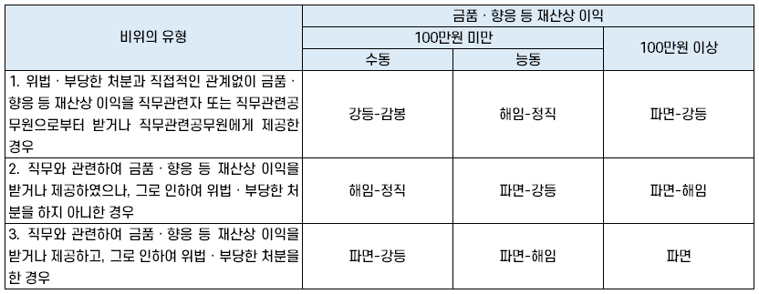 | 비위의 유형 | 금품ㆍ향응 등 재산상 이익 | ||