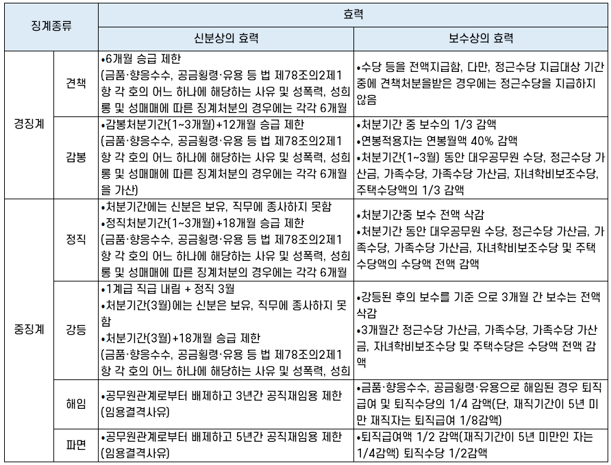 징계 종류마다 승급 및 보수 등에 제한이 생기는데요. 각 공무원 징계 종류별 신분상·보수상 효력은 아래 표와 같습니다.