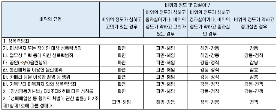 | 가. 미성년자 또는 장애인 대상 성폭력범죄 | 파면 | 파면-해임 | 해임-강등 | 강등 |