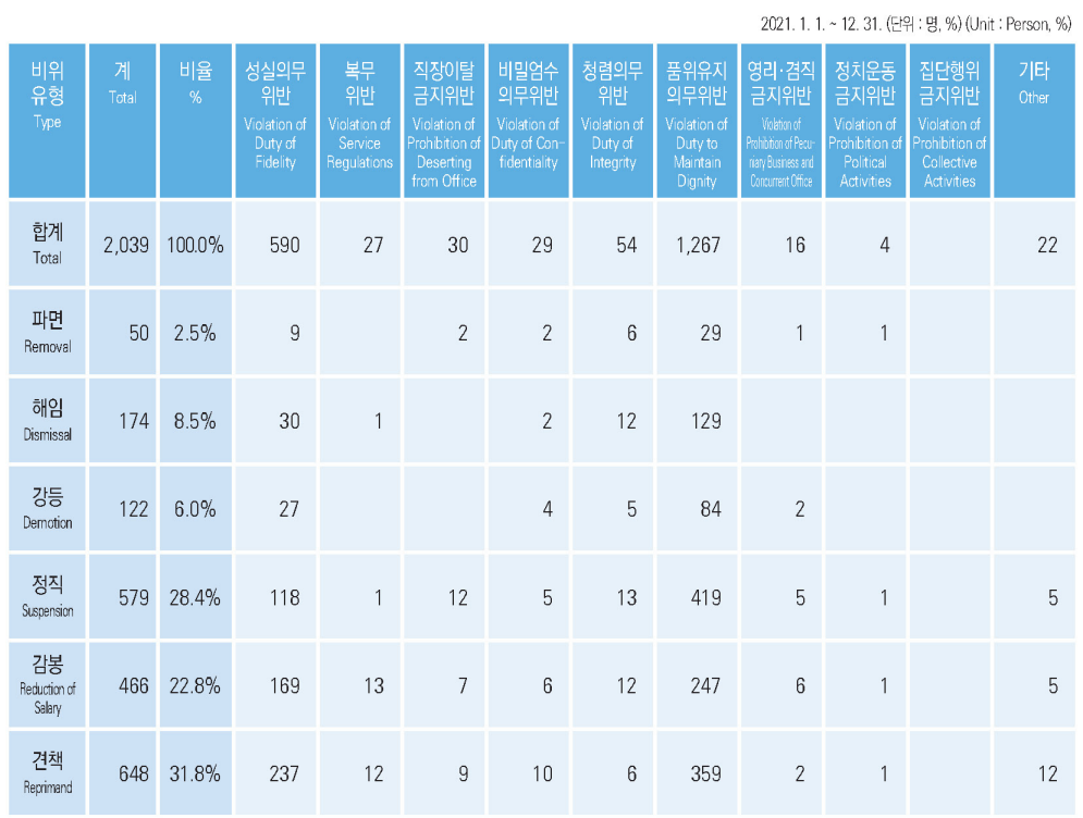 2022년 6월에 인사혁산처가 발간한 2021년 기준 인사통계연보를 보면 2021년 1년 동안 총 2,039명의 공무원이 징계를 받았는데요. 견책이 648명으로 가장 많았고, 정직 처분을 받은 경우가 579명, 감봉처분을 받은 공무원이 466명이었며, 해임 처분은 174명, 강등은 122명, 파면은 50명이었습니다.