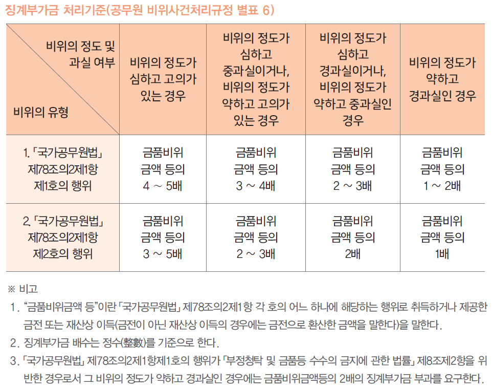 공무원 징계와 별개로 징계부가금을 부과하는 제재도 있는데요. 금품 관련 비리의 경우 징계만으로는 적절한 제재가 될 수 없어 징계의 실효성을 확보하기 위해 위 6가지 징계처분 외에 금품수수 금액 등의 5배 범위 내에서 징계 부과금을 부과하고 있습니다(국가공무원법 제78조의 2).