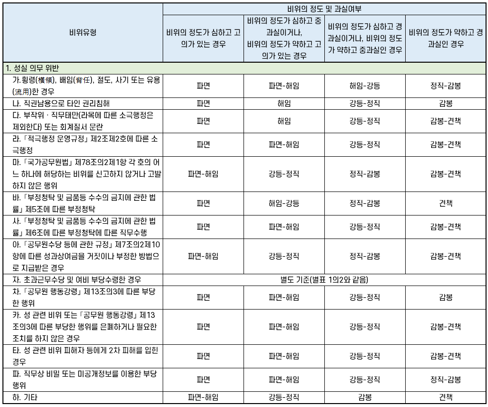 | 비위의 정도가 심하고 고의가 있는 경우 | 비위의 정도가 심하고 중과실이거나, 비위의 정도가 약하고 고의가 있는 경우 | 비위의 정도가 심하고 경과실이거나, 비위의 정도가 약하고 중과실인 경우 | 비위의 정도가 약하고 경과실인 경우 | |