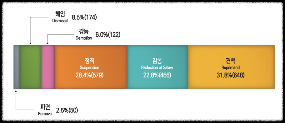 2022년 6월에 인사혁산처가 발간한 2021년 기준 인사통계연보를 보면 2021년 1년 동안 총 2,039명의 공무원이 징계를 받았는데요. 견책이 648명으로 가장 많았고, 정직 처분을 받은 경우가 579명, 감봉처분을 받은 공무원이 466명이었며, 해임 처분은 174명, 강등은 122명, 파면은 50명이었습니다.