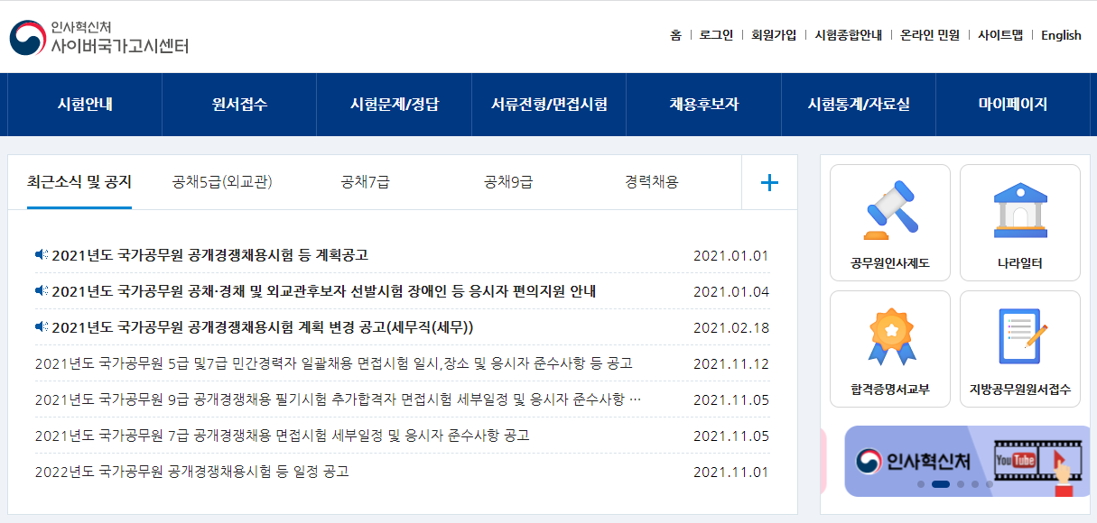 9급, 7급, 5급(행정고시, 기술고시)공채 | 인사혁신처 | 인사혁신처 사이버국가고시센터 |