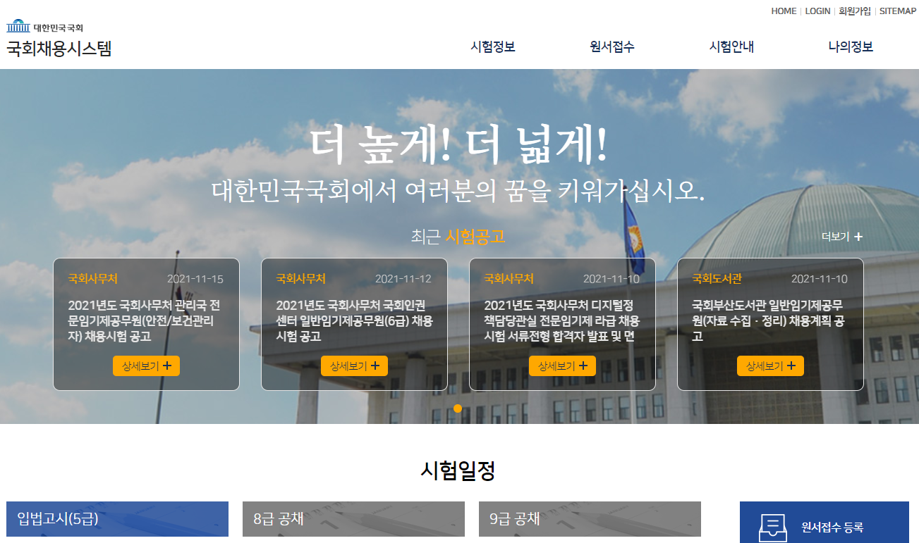 | 국회공무원 | 입법고시(5급), 8급, 9급 공채 | 국회사무처 | 국회채용시스템 |