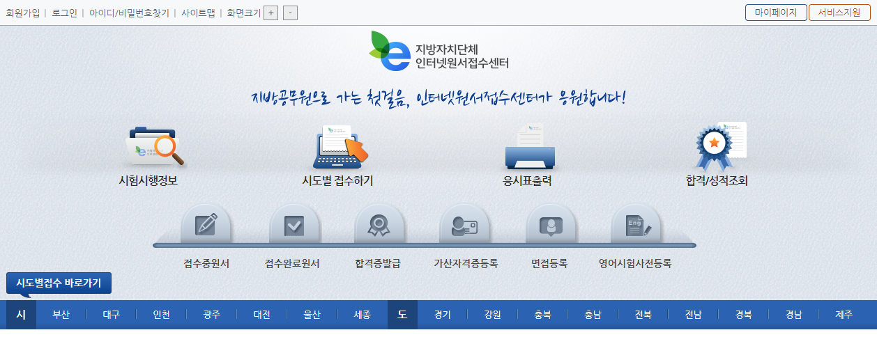 각 지방자치단체가 개별적으로 채용 절차를 진행하기 때문에 각 홈페이지에서 시험 시행 계획과 경쟁률 및 합격선 등의 정보를 확인할 수 있지만, 응시자의 편의를 위해 서울을 제외한 부산, 대구, 인천, 광주, 대전, 울산, 세종, 경기, 강원, 충북, 충남, 전북, 전남, 경북, 경남, 제주도의 모든 지방자치단체의 채용 정보를 지방자치단체 인터넷원서접수센터에서 일괄적으로 공고하고 원서접수를 진행하고 있습니다.