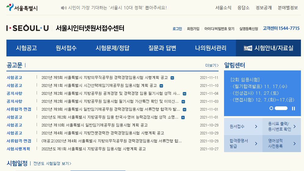 서울특별시만이 별도로 '서울시인터넷원서접수센터'를 운영하고 있기 때문에 서울시 지방직 공무원에 관한 정보는 이 사이트에서 확인해야 합니다.