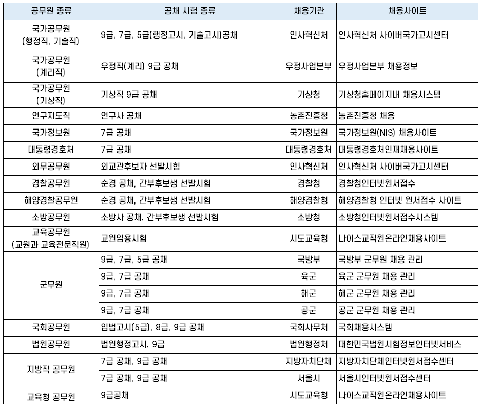 | 공무원 종류 | 시험 종류 | 채용기관 | 채용사이트 |