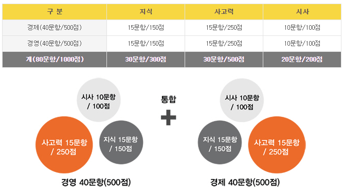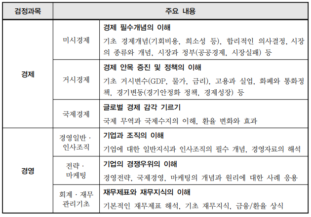매경테스트 시험은 경제와 경영을 시험과목으로 하며 세부 출제 내용은 아래 표와 같습니다.