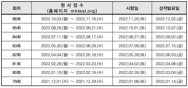 매경TEST는 2015년부터 연 8회 토요일에 시험이 시행되는데요. 2022년에는 제79회 시험부터 86회 시험까지 총 8번의 시험이 1월 8일, 2월 26일, 4월 2일, 5월 28일, 7월 9일, 8월 27일, 10월 1일, 11월 26일에 시행됩니다.