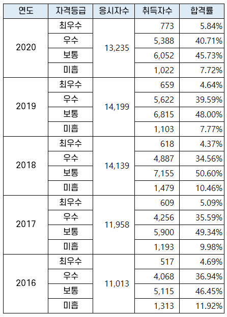 | 연도 | 자격등급 | 응시자수 | 취득자수 | 합격률 |