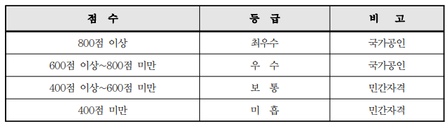 시험 성적은 1,000점 만점기준으로 평가를 하는데요. 800점 이상이면 최우수 등급, 600점 이상 800점 미만이면 우수 등급, 400점 이상 600점 미만은 보통 등급, 400점 미만은 보통 등급을 받게 됩니다.