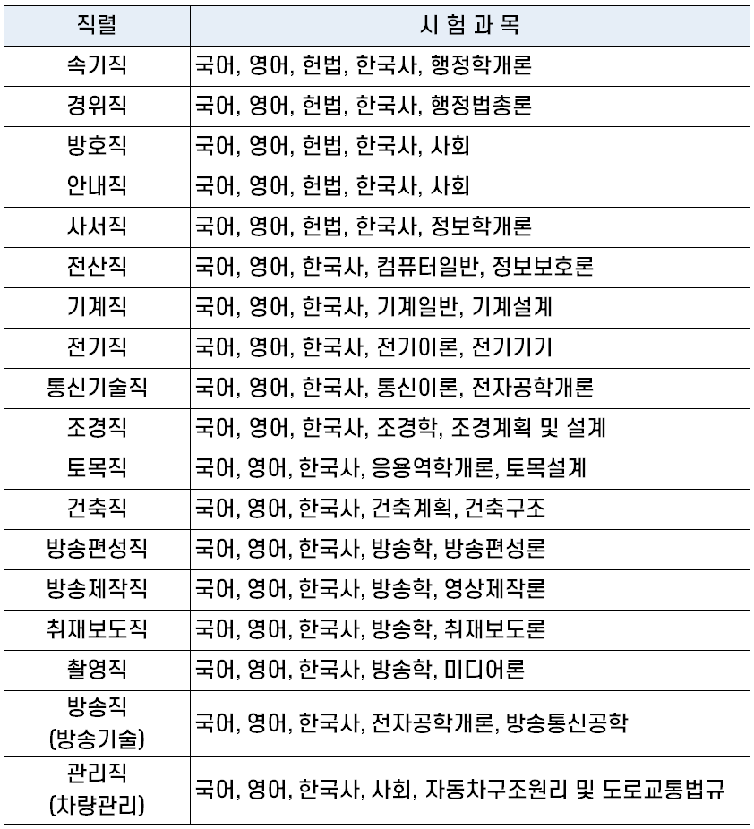 | 안내직 | 국어, 영어, 헌법, 한국사, 사회 |