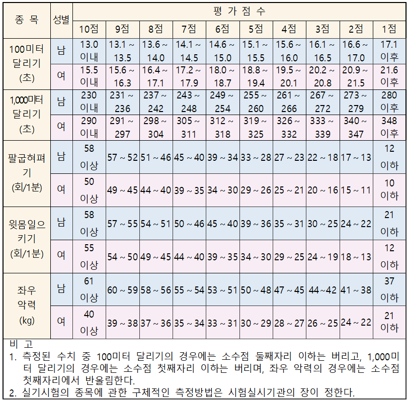 | 팔굽혀펴기(회/1분) 윗몸일으키기(회/1분) 좌우 악력 100미터 달리기(초) 1,000미터 달리기(초) |