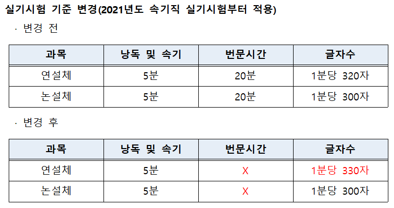 논설체와 연설체를 시험과목으로 하는 국회 속기직 실기시험은 2021년부터 시험 방식이 아래와 같이 변경되었는데요. 연설체는 1분당 320자에서 330자로 조정되었습니다.