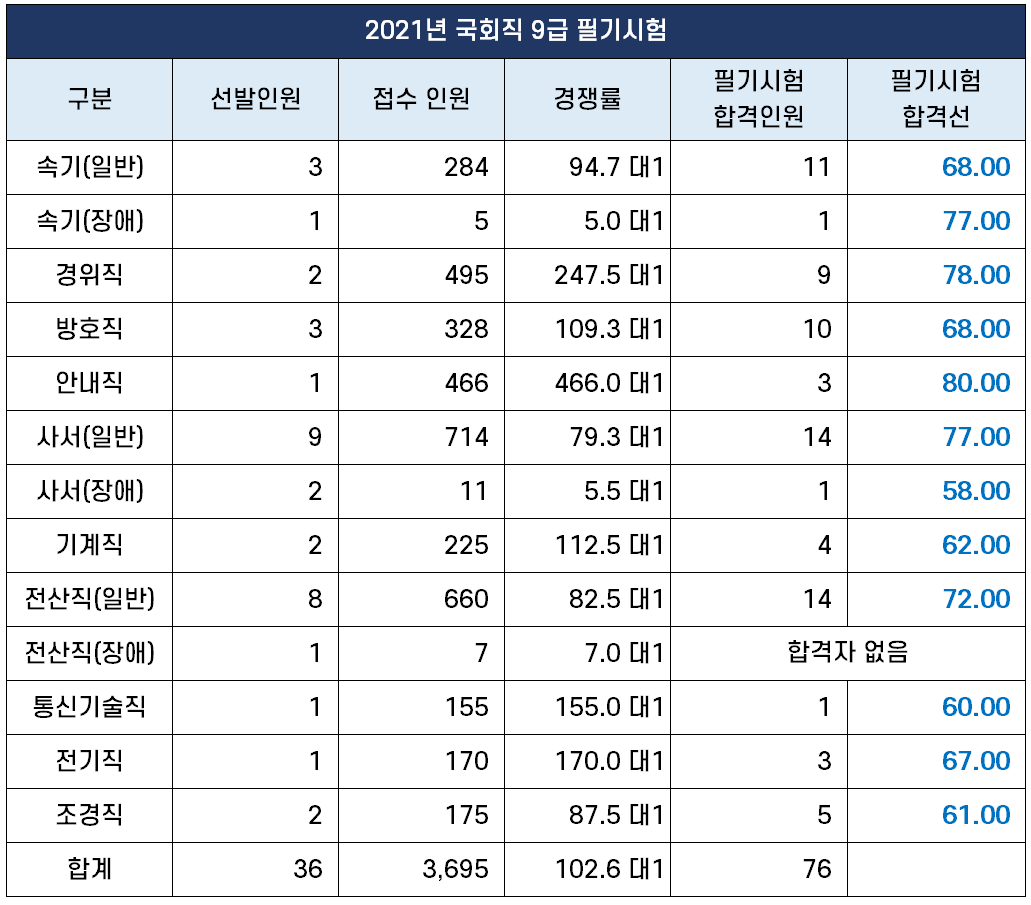 8월 14일 (토)에 실시되었던 2021년 국회 9급 공채 필기시험의 합격선은 아래 표와 같은데요. 경쟁률이 가장 높았던 안내직 합격선이 80점으로 가장 높은 커트라인(cut-line)을 기록했습니다.