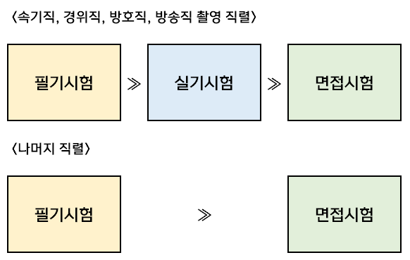 필기시험 합격자를 대상으로 실기시험을 시행하는 직렬인 속기직은 한글속기 실기 시험을, 방송직 촬영 직렬은 촬영 실기 시험을, 경위직 및 방호직은 체력측정 시험을 시행합니다.