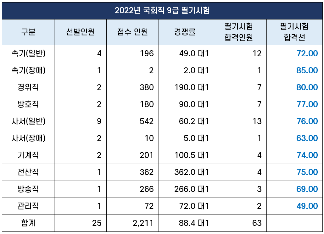 8월 13일(토)에 시행된 2022년 국회 9급 공채 필기시험 합격선은 아래 표와 같은데요. 경쟁률이 190.0대 1이었던 경위직의 합격선이 80.00점으로 가장 높은 커트라인을 기록했습니다.