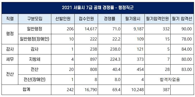 2021년 서울시 7급 행정직은 일반행정, 감사, 세무(지방세), 전산 직렬에서 총 242명을 선발하는데요. 157명을 선발했던 지난해보다 모집인원이 100명 가까이 증가해 경쟁률도 하락했습니다.