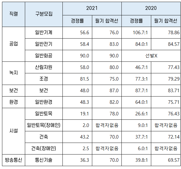2021년 서울시 7급 공무원 기술직 합격선과 경쟁률을 2020년과 비교하면 아래표와 같습니다.