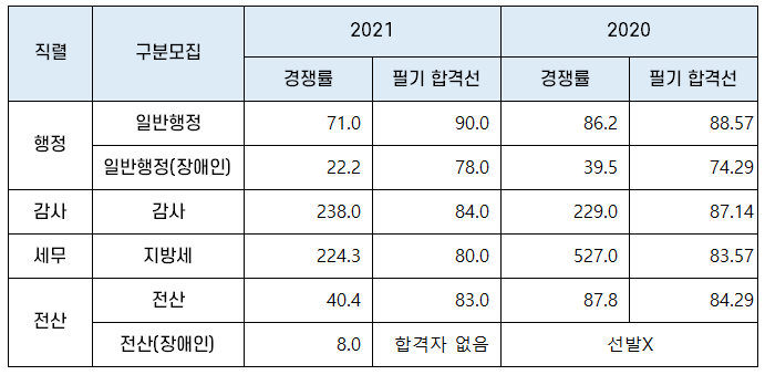 2021년 서울시 7급 공무원 행정직 합격선과 경쟁률을 2020년과 비교하면 아래표와 같습니다.