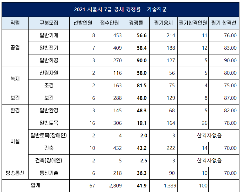 2021년 서울시 7급 기술직은 10개 직렬에서 총 67명을 선발하는데요. 48명을 선발했던 지난해보다 모집인원이 증가해 경쟁률도 소폭 하락했습니다.