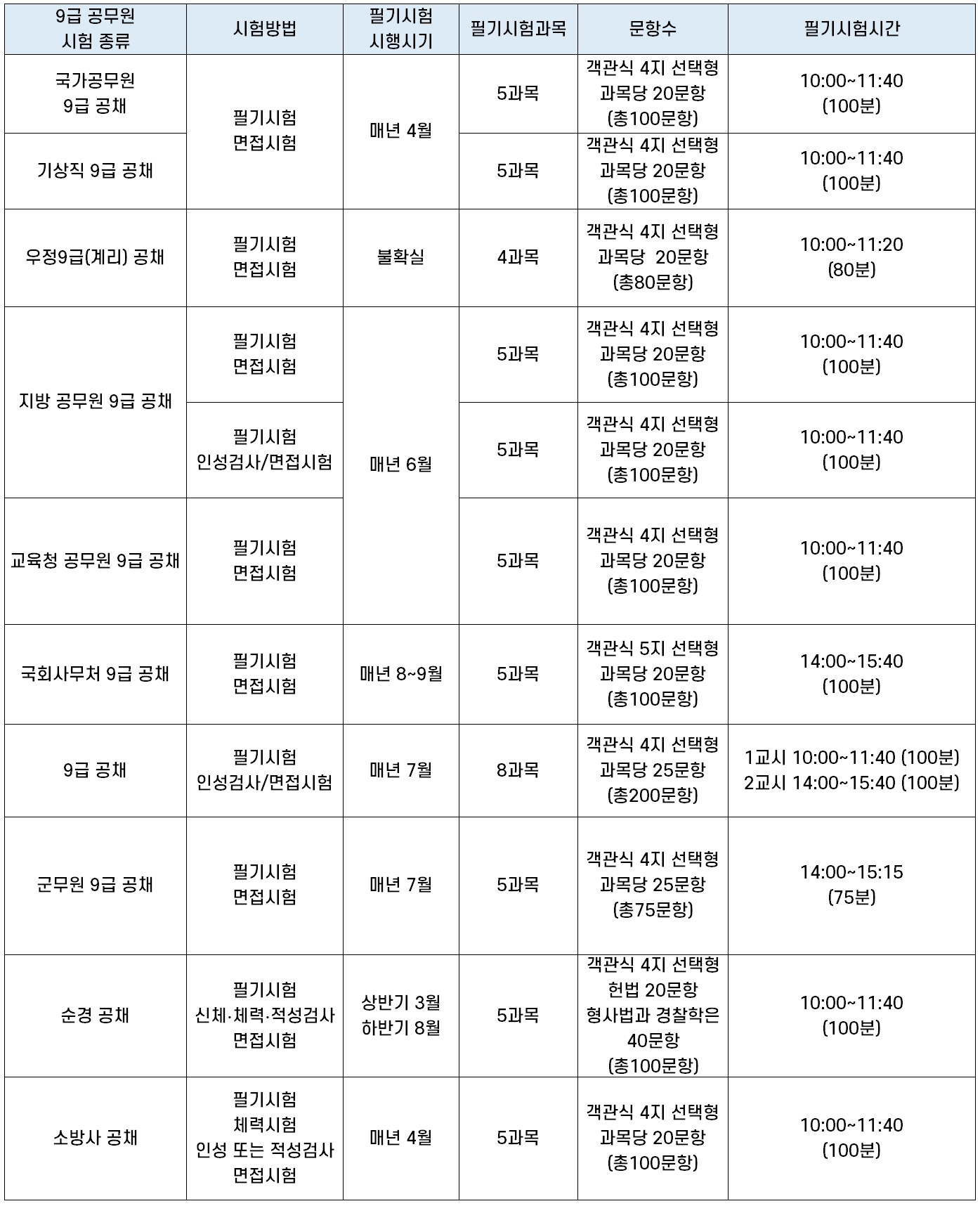 | 기상직 9급 공채 | 5과목 | 객관식 4지 선택형 과목당 20문항 (총100문항) |