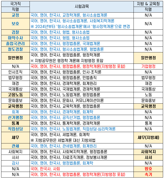 | 선거행정 | 국어, 영어, 한국사, 공직선거법, 행정법총론 | N/A |