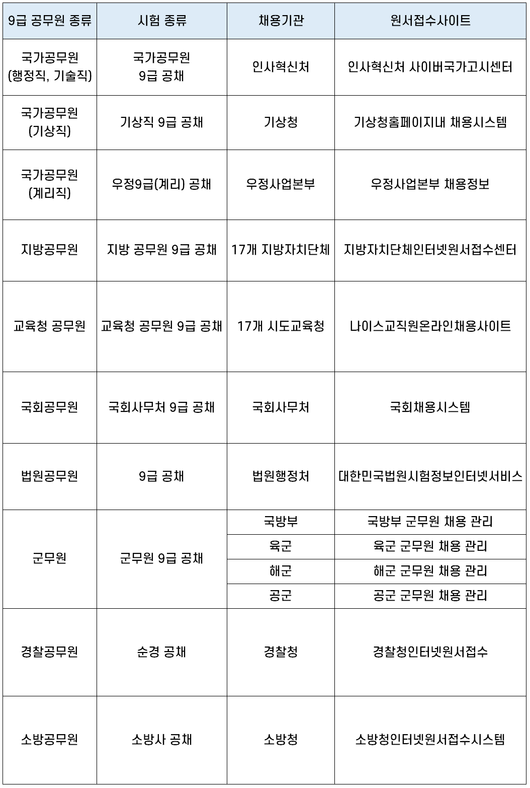 | 9급 공무원 종류 | 시험 종류 | 채용기관 | 원서접수사이트 |