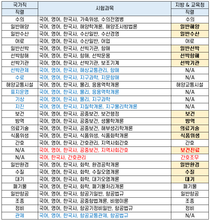 | 보건 | 국어, 영어, 한국사, 공중보건, 보건행정 | 보건 |