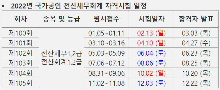 2022년에는 짝수 달마다 총 6번의 전산세무 1ㆍ2급, 전산회계 1ㆍ2급 시험이 실시되는데요. 각 회차별 시험일과 원서접수기간 등 2022년 시험일 정은 아래 표와 같고 회차별 원서 접수 수수료는 25,000원입니다.