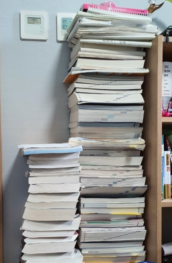 아래 사진은 법률저널에 실린 김민지씨가 1차와 2차 시험을 준비하면서 공부했던 교재들을 쌓아 올린 사진인데요. 손때 뭍은 책을 보면서 얼마나 치열하게 공부했을지 간접적으로 느낄 수 있었습니다.