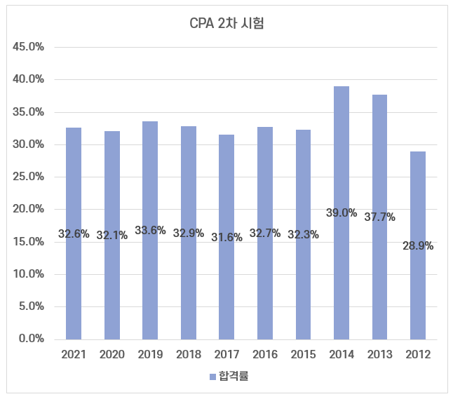 공인회계사 2차 시험의 평균 합격률은 30% 정도로 1차 합격률보다는 높지만 어려운 1차 시험에 합격하고도 3명 중에 2명이 불합격해 자격증을 취득하지 못합니다.