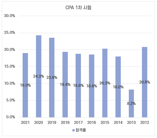 아래 그래프는 최근 10년간 공인회계사 1차 시험 합격률인데요 연도별 시험 난이도에 따라 합격률 편차가 있기는 하지만 1차 시험 평균 합격률은 20% 정도 됩니다. CPA 시험에 진입한 5명 중 1명 밖에 1차 시험에 합격하지 못할 정도로 쉽지 않은 시험인 거죠.