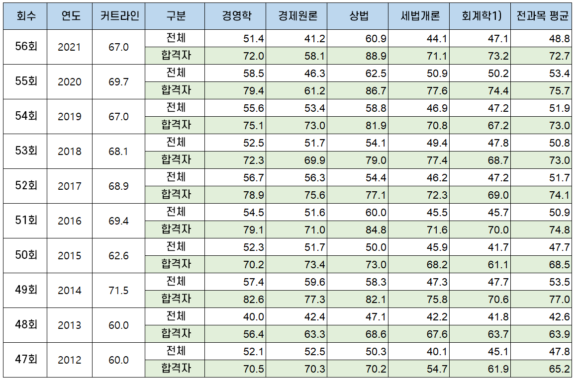 최근 10년간 회계사 1차 시험 커트라인과 과목별 평균점수를 요약한 아래 표로 연도별, 과목별 1차 시험 난이도를 가늠해보면 좋을 것 같습니다. (참고로 CPA 시험에 관한 각종 통계는 하단에 링크를 첨부한 포스팅에 정리했습니다).