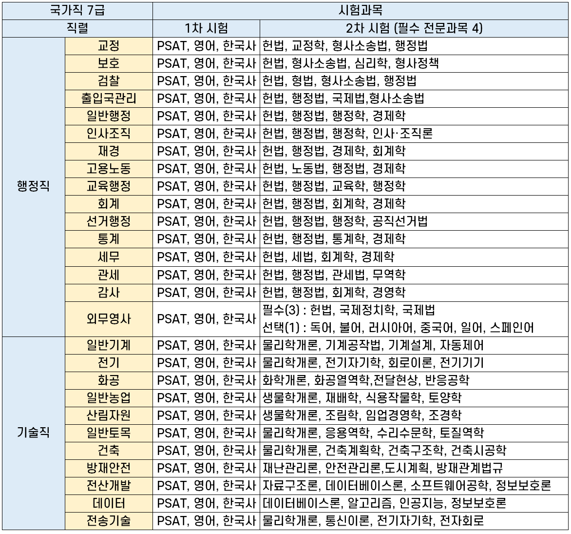 | 외무영사 | PSAT, 영어, 한국사 | 필수(3) : 헌법, 국제정치학, 국제법 선택(1):독어,불어,러시아어,중국어,일어,스페인어 |