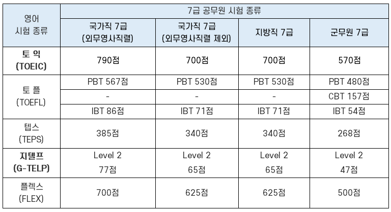 7급 공무원 시험 종류 별 영어 과목을 대체하는 영어 시험 종류와 기준점수는 아래 표와 같은데요. 군무원의 기준 점수가 가장 낮고, 국가직 7급 중 외무영사 직렬이 제일 높으며, 외무영사 직렬을 제외한 국가직 7급과 지방직 7급의 영어 기준점수는 동일합니다.